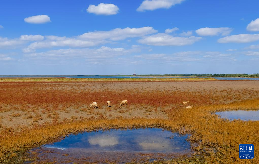 11月10日,麋鹿在江苏东台条子泥湿地栖息(无人机照片)。