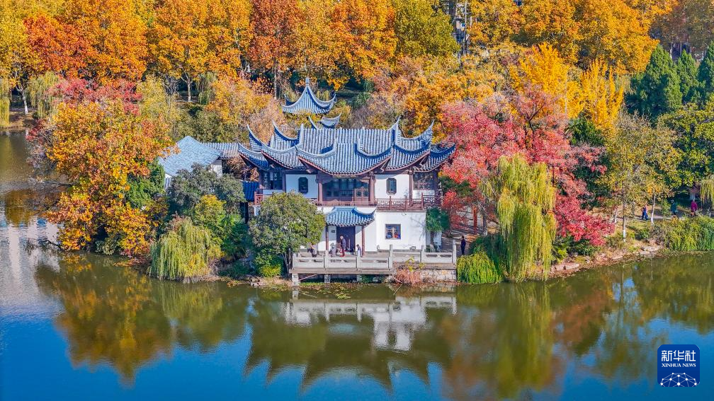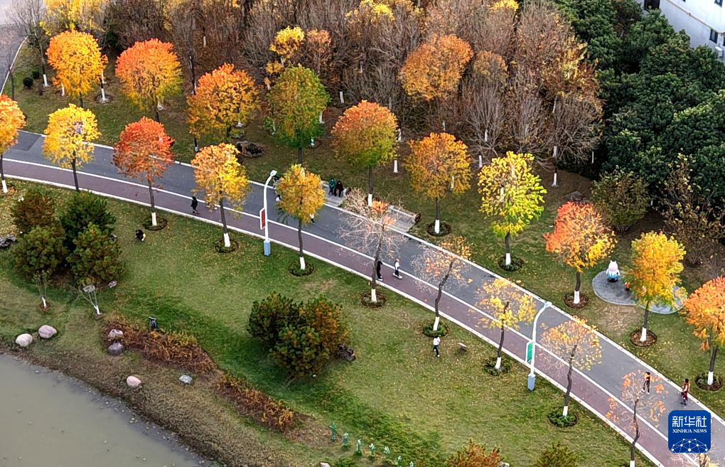 11月10日拍摄的南京中山植物园月牙堤景色(无人机照片)。