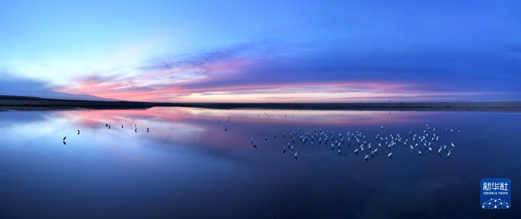 在甘肃省酒泉市阿克塞哈萨克族自治县,白鹭在冬不拉水库栖息觅食(无人机照片,11月9日摄)。