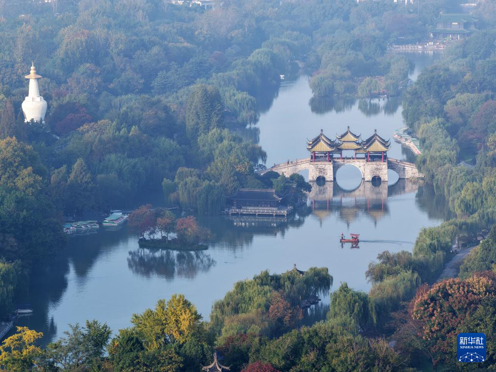 11月10日拍摄的晨雾中的江苏扬州瘦西湖风景区(无人机照片)。
