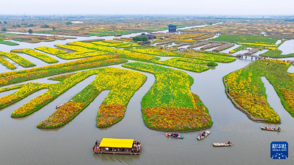 11月10日,游客在江苏省兴化市千垛景区乘船游玩(无人机照片)。