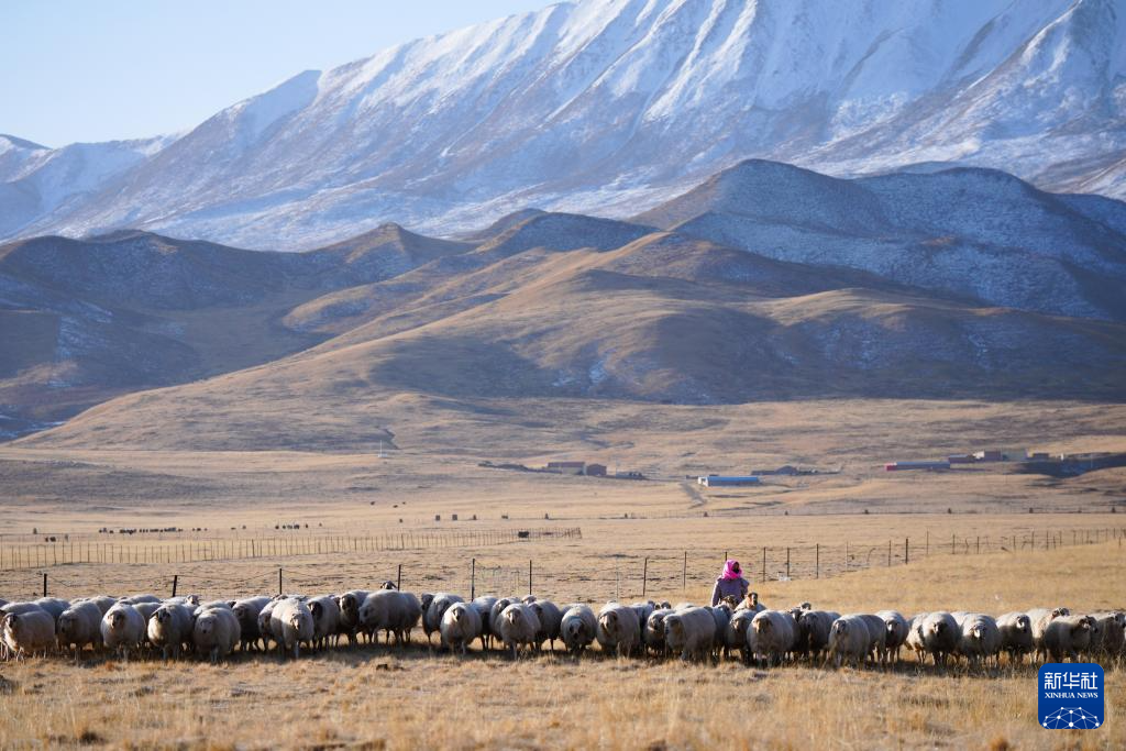 这是11月9日在青海省海北藏族自治州祁连县仟户牧场草场拍摄的无角藏羊羊群。