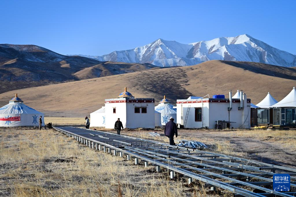 11月10日,工人在青海省海北藏族自治州祁连县仟户牧场的牧旅营地施工。