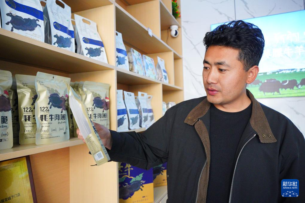11月11日,叶旦多杰在位于青海省海北藏族自治州祁连县的仟户牧场销售门店展示零食产品。