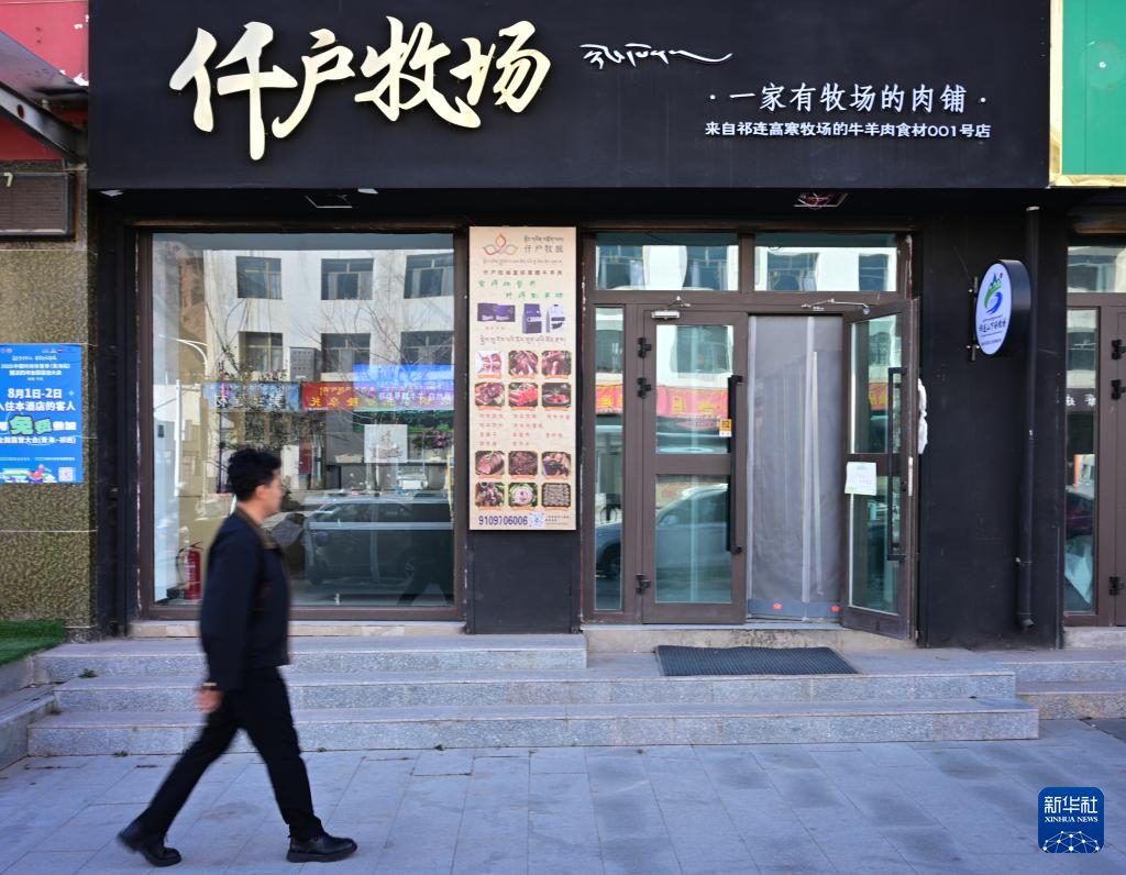 11月11日,叶旦多杰走过位于青海省海北藏族自治州祁连县仟户牧场的销售门店。