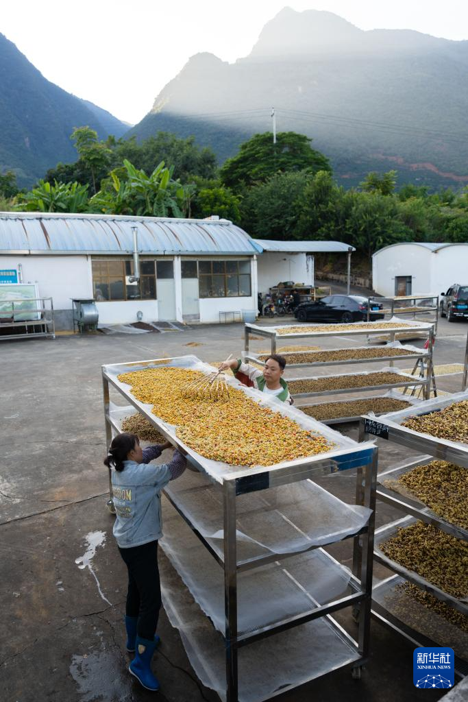 11月16日,咖农在云南省保山市隆阳区新寨村一处咖啡庄园晾晒咖啡豆。