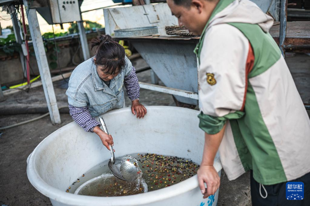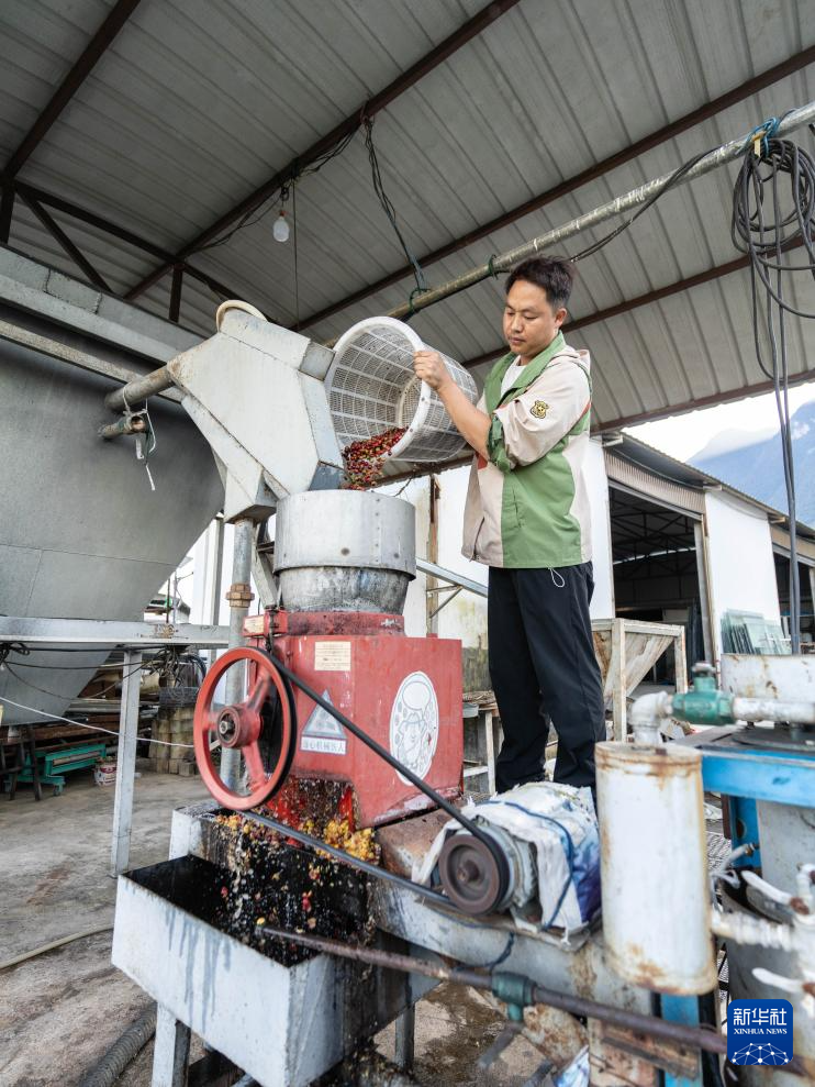 11月16日,咖农在云南省保山市隆阳区新寨村一处咖啡庄园去除咖啡果皮。