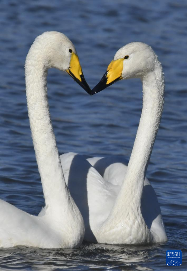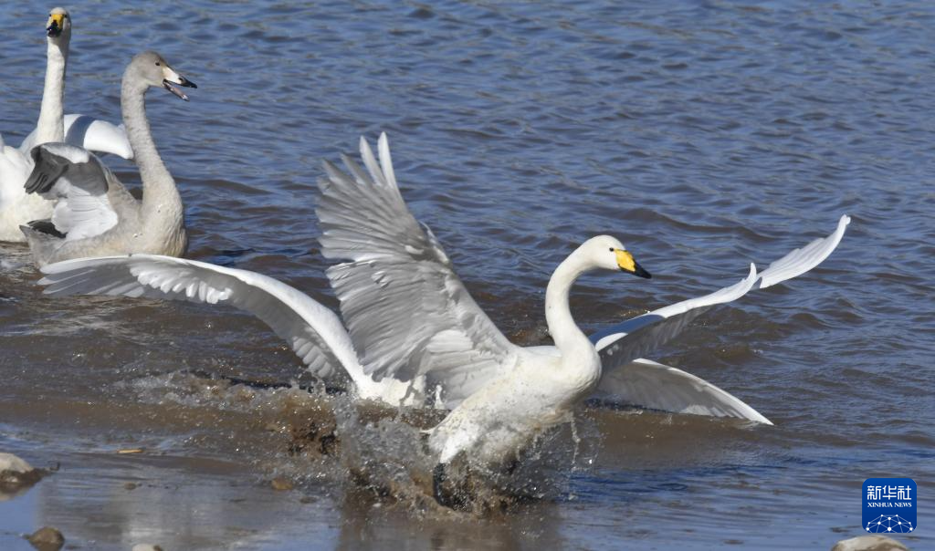 11月20日,天鹅在密云水库流域的清水河中嬉戏。 近期,北京密云水库迁徙候鸟数量持续攀升,上万只天鹅、豆雁、赤麻鸭、灰鹤等候鸟栖息在密云水库流域大小河流中。密云水库是东亚——澳大利亚候鸟迁徙线路上重要的中转站和栖息点,密云水库管理处开展了候鸟动态监测、食源补给、鸟类栖息浅滩修复、救助受伤体弱候鸟、引导文明观鸟等一系列管护措施,全方位守护候鸟迁徙“生态服务区”。 新华社记者 李欣 摄