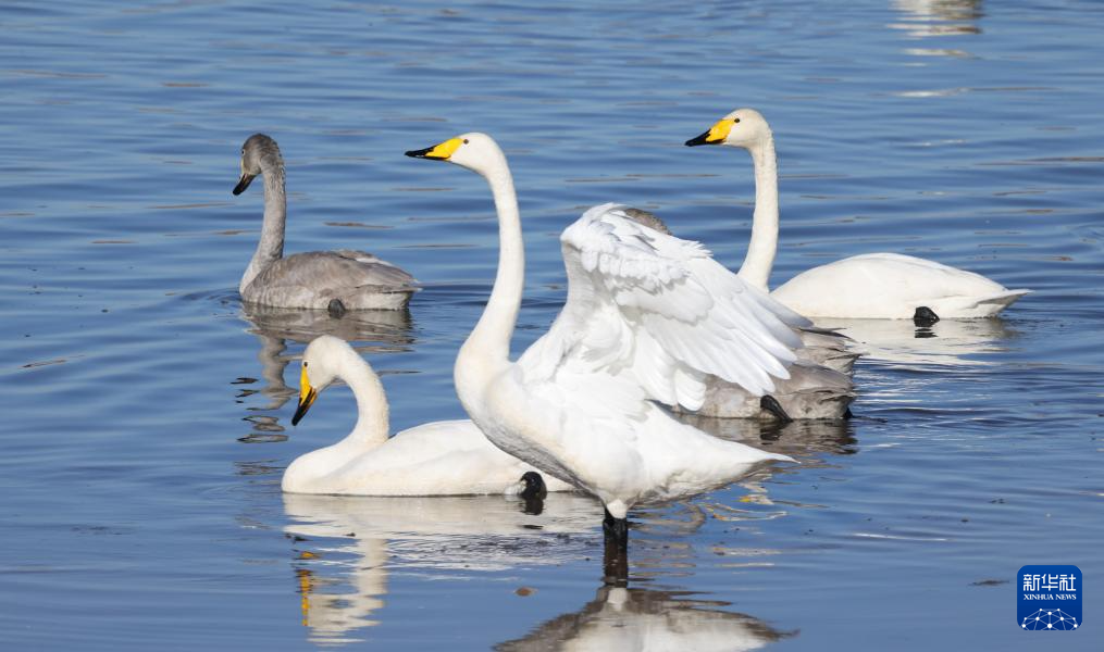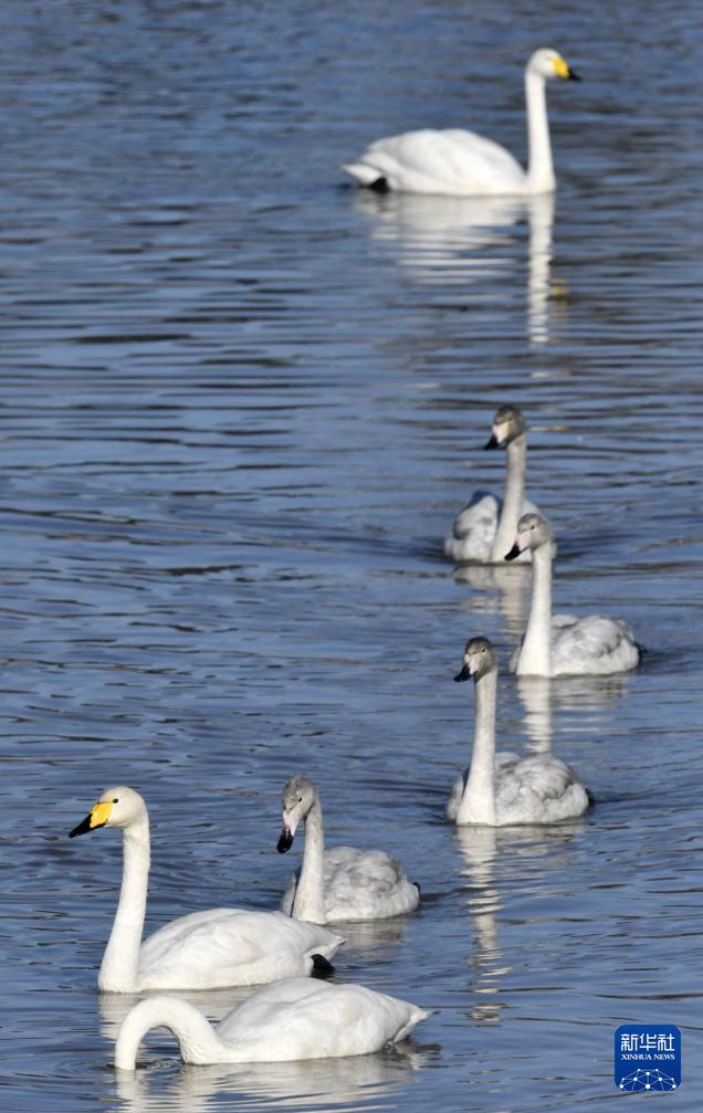 11月20日,天鹅在密云水库流域的清水河中栖息。 近期,北京密云水库迁徙候鸟数量持续攀升,上万只天鹅、豆雁、赤麻鸭、灰鹤等候鸟栖息在密云水库流域大小河流中。密云水库是东亚——澳大利亚候鸟迁徙线路上重要的中转站和栖息点,密云水库管理处开展了候鸟动态监测、食源补给、鸟类栖息浅滩修复、救助受伤体弱候鸟、引导文明观鸟等一系列管护措施,全方位守护候鸟迁徙“生态服务区”。 新华社记者 李欣 摄