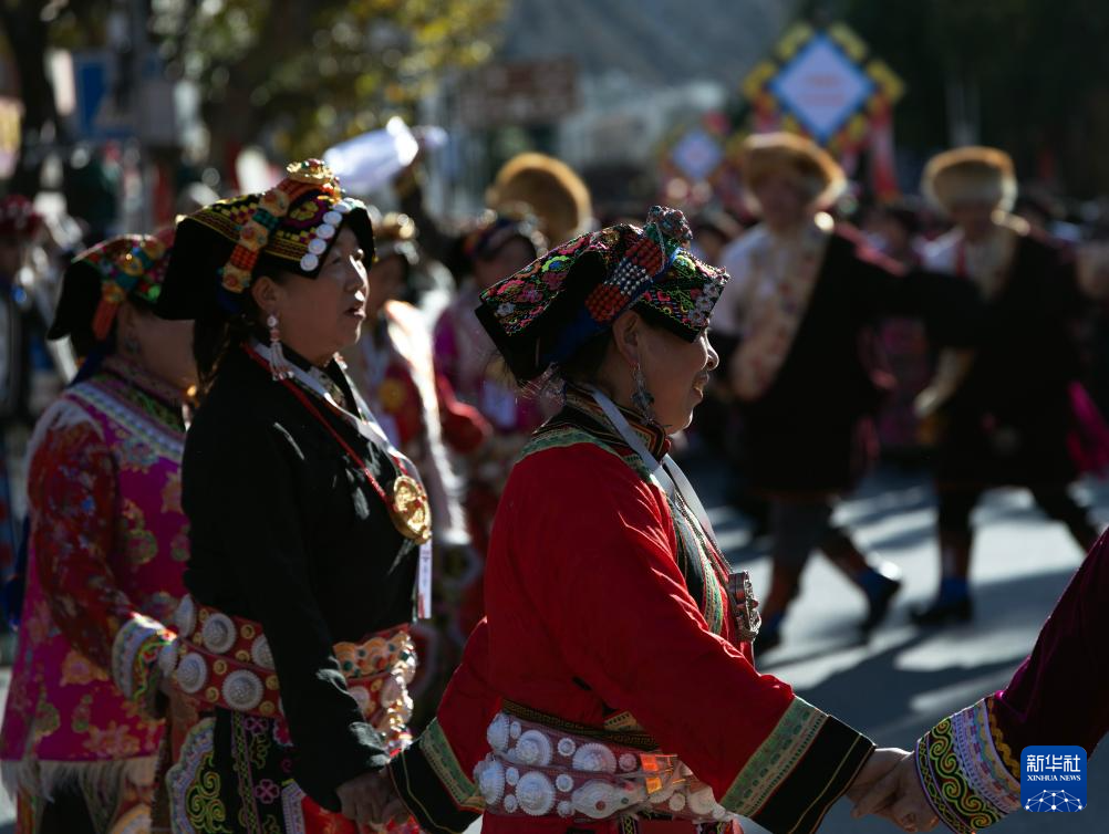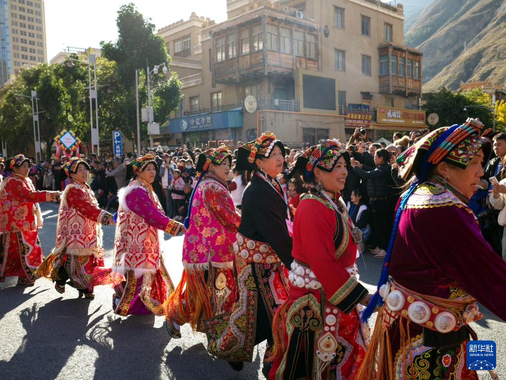 11月19日,在四川省汶川县城,身着民族服饰的妇女在非遗大巡游活动上表演。 11月19日,四川省汶川县举行非遗大巡游活动,开启“大美阿坝·幸福羌年”2025羌年庆祝系列活动。 新华社发(兰红光摄)