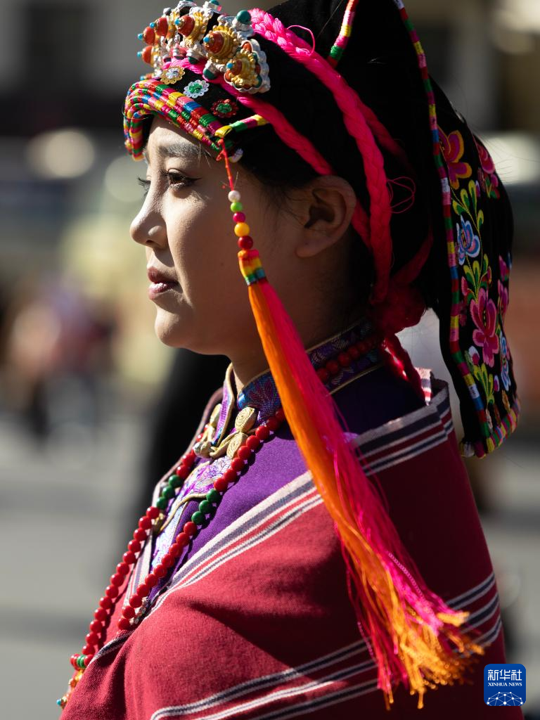 11月19日,在四川省汶川县城,一名身着民族服饰的姑娘参加非遗大巡游活动。 11月19日,四川省汶川县举行非遗大巡游活动,开启“大美阿坝·幸福羌年”2025羌年庆祝系列活动。 新华社发(兰红光摄)