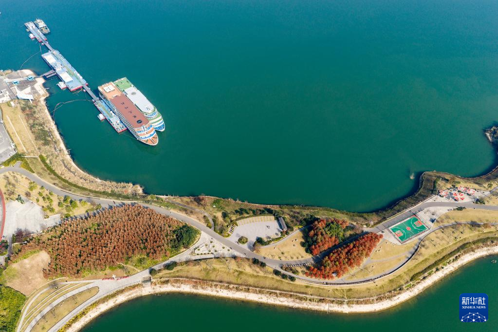 12月7日,游客在浙江省绍兴市上虞区永和镇麻岙水库游玩(无人机照片)。