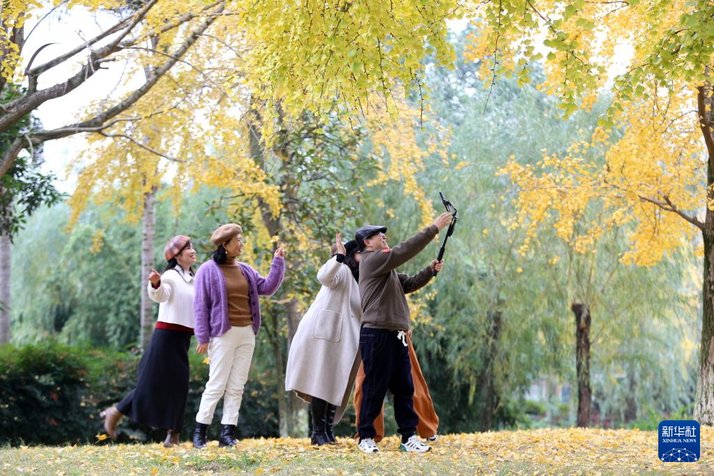 12月6日,市民在四川省乐山市一处银杏树下游玩拍照。