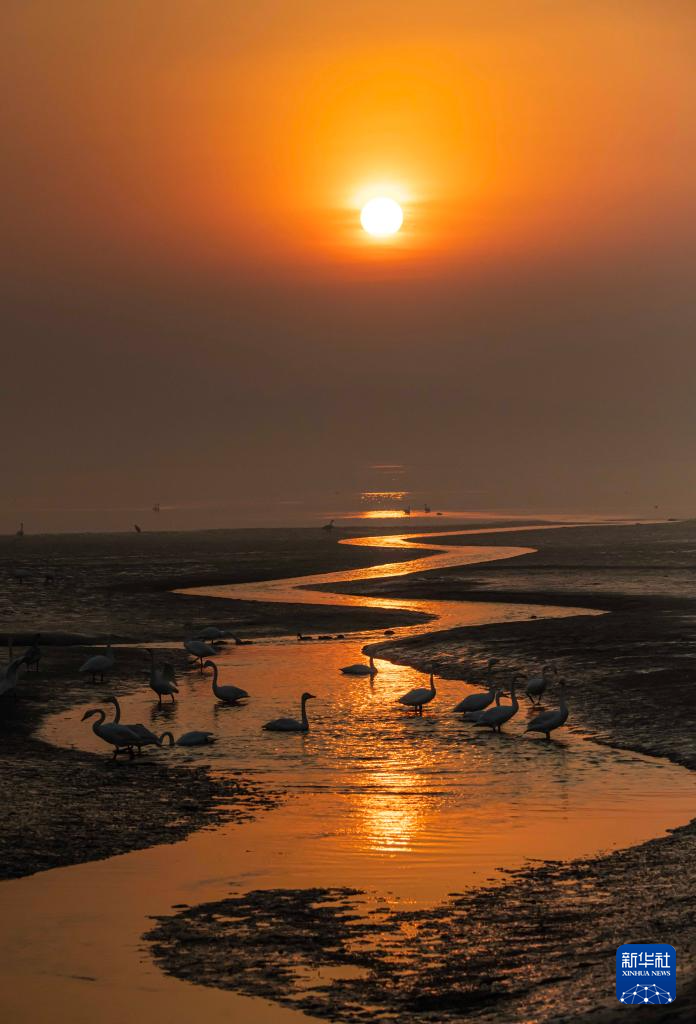 12月6日,群鸟在江苏兴化里下河国家湿地公园内栖息、觅食(无人机照片)。