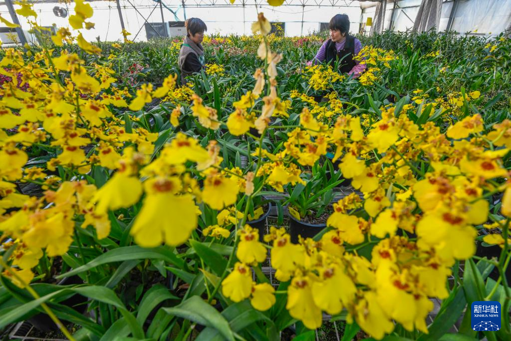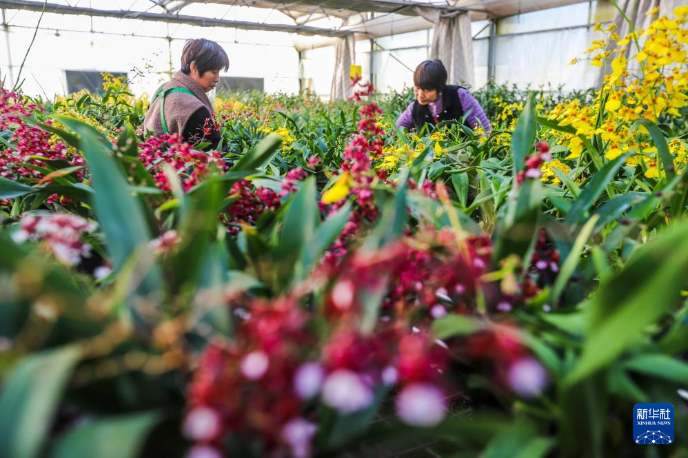 12月17日,工作人员在河北省迁西县罗家屯镇一家花卉种植基地的花卉种植车间工作。 新年将至,河北省各地年宵花市场迎来销售旺季,商家积极备货,供应节日市场需求。 新华社发(刘满仓摄)