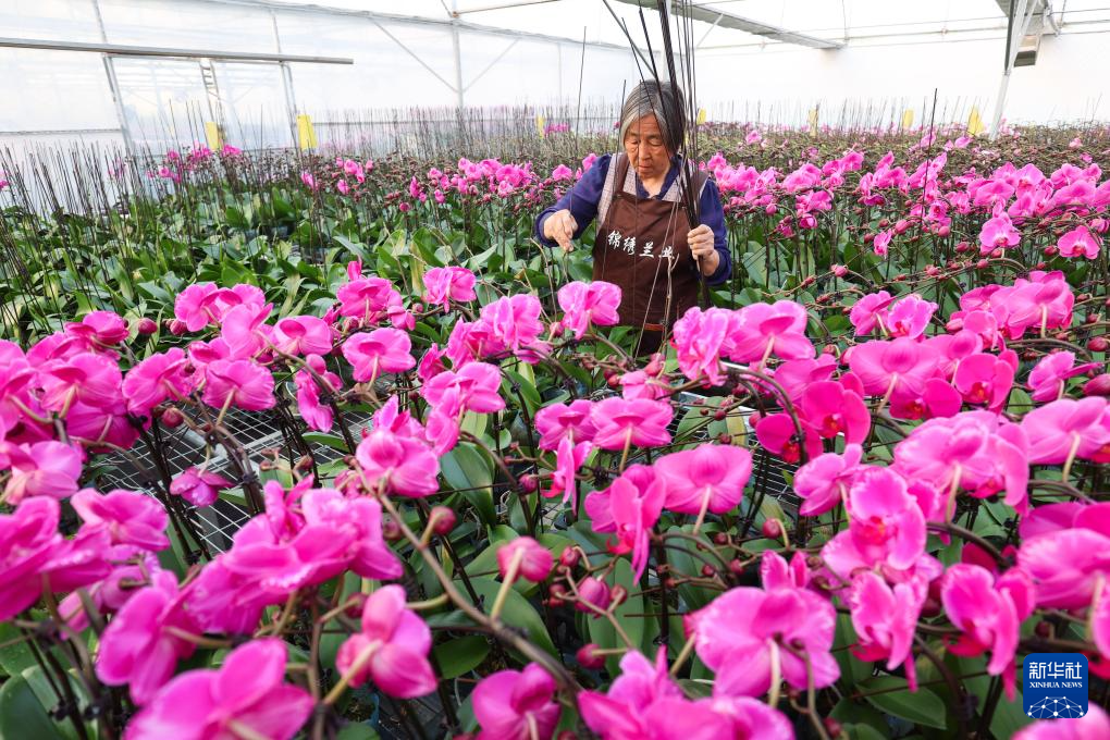 12月17日,工作人员在河北省石家庄市藁城区廉州镇一家花卉种植基地养护蝴蝶兰花卉。 新年将至,河北省各地年宵花市场迎来销售旺季,商家积极备货,供应节日市场需求。 新华社发(梁子栋摄)