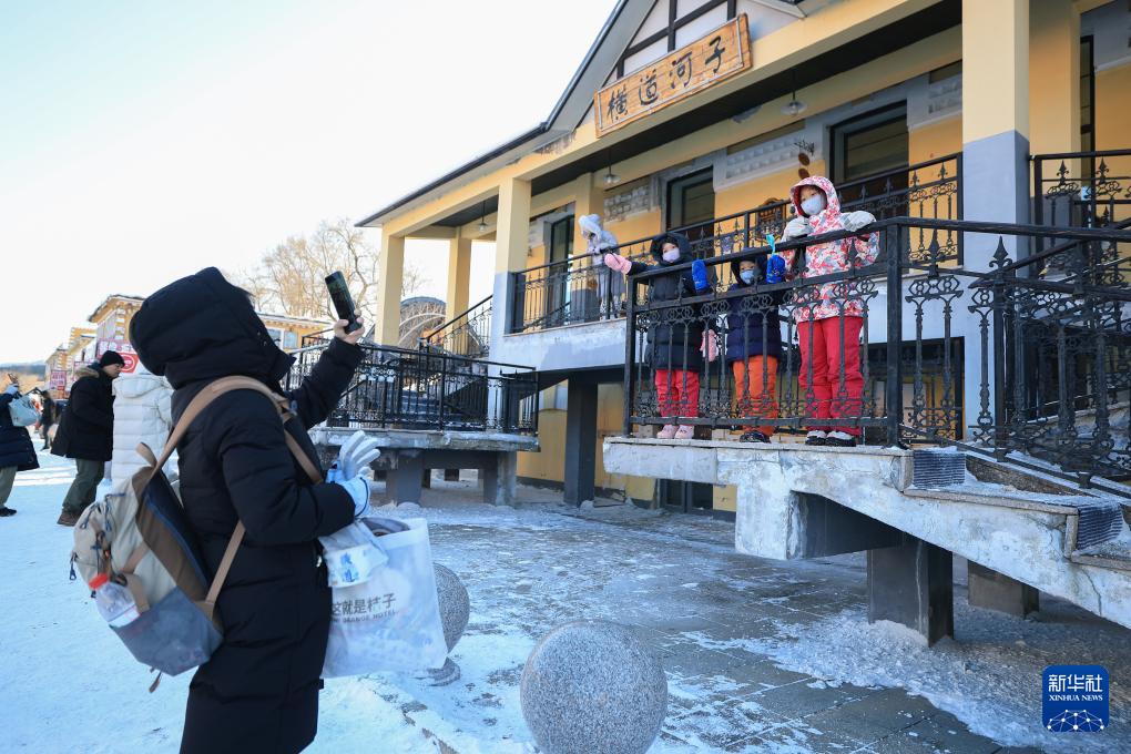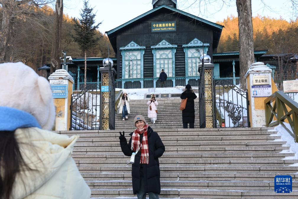 12月24日,游客在横道河子镇中东铁路博物馆前拍照。 进入冰雪季,有着百年历史的黑龙江省海林市横道河子镇吸引众多游客前来打卡。始建于1897年的横道河子镇拥有200余栋俄式风格的老建筑,在白雪映衬下,美如童话世界。 新华社发(徐率摄)