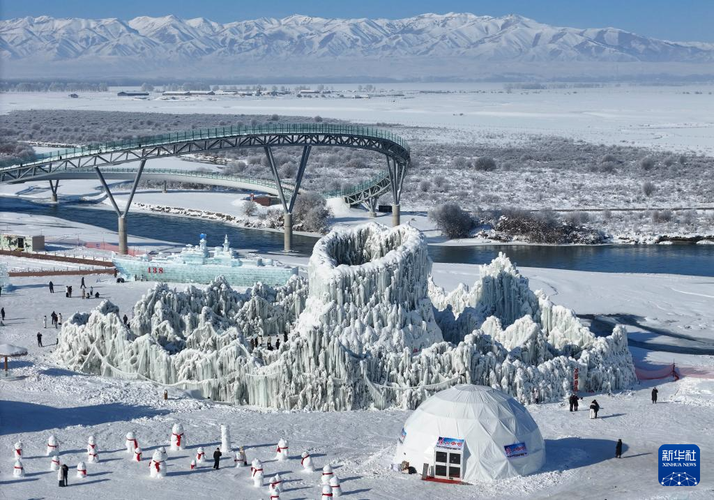 1月3日,游客在新疆昭苏县冰雪乐园参观冰雕作品。