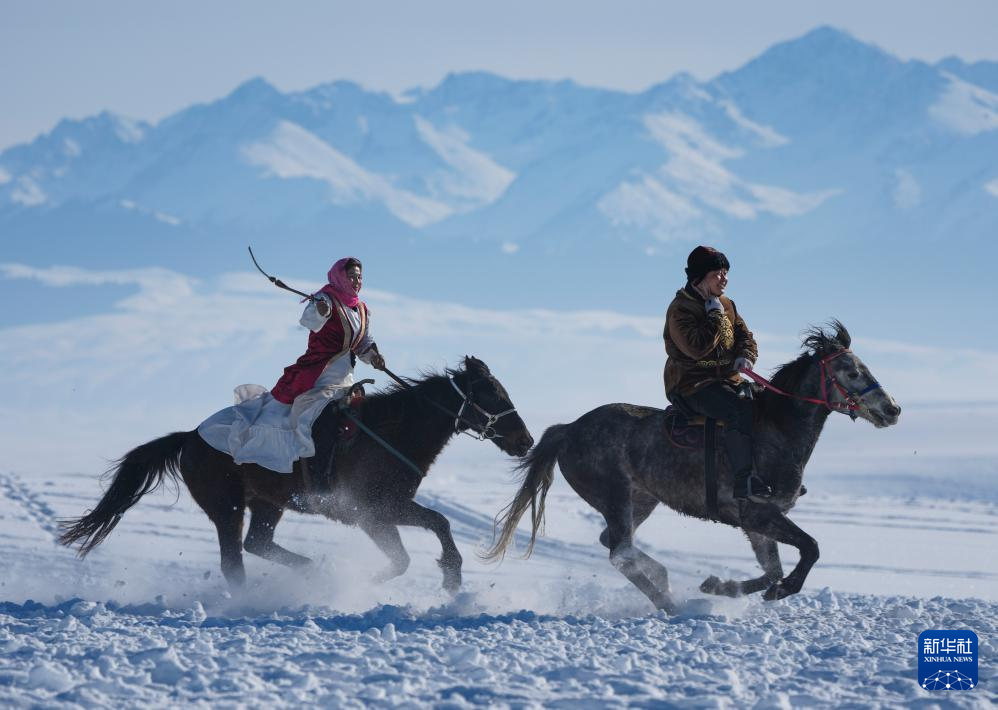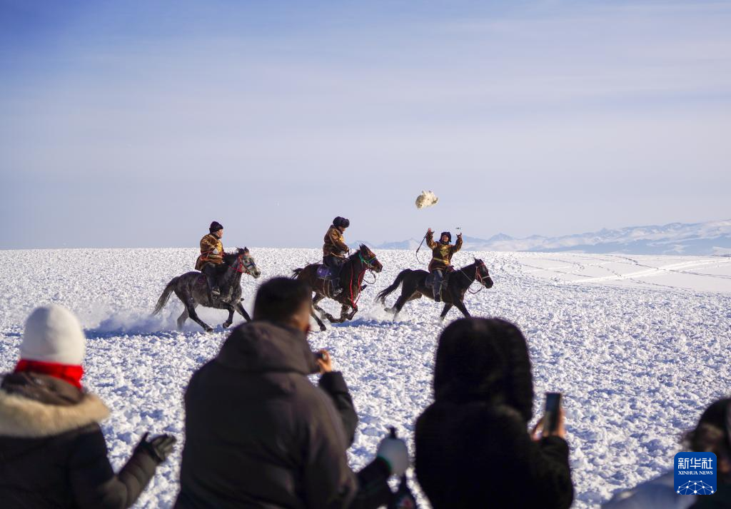 这是1月3日在新疆昭苏湿地公园拍摄的传统民俗“叼羊”表演。