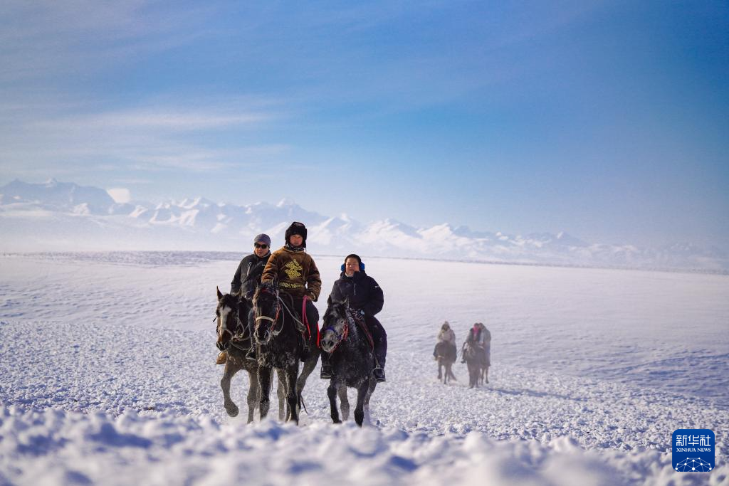 1月3日,游客(左一、左三)在新疆昭苏湿地公园体验骑马。
