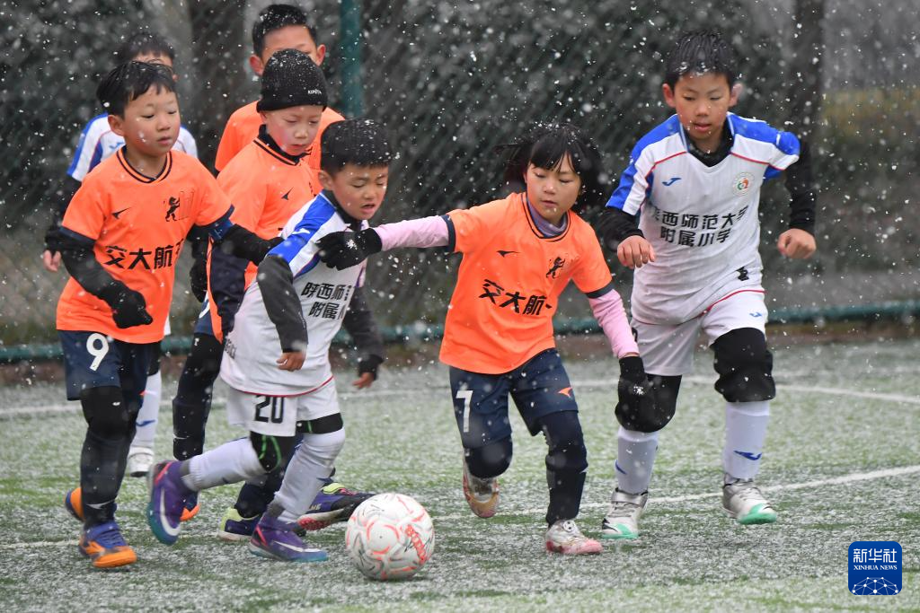 1月3日,在西安市举行的2026西少杯·贺岁青少年足球赛中,小队员们在雪中进行U7组别的比赛。