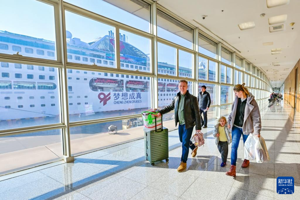 1月3日,游客在天津国际邮轮母港内准备办理入境手续。