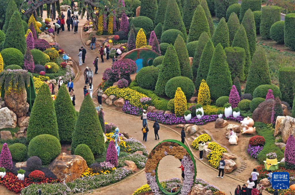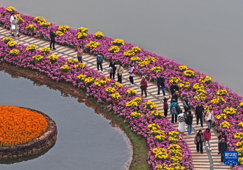 1月3日,游客在广西南宁市青秀山风景区观赏菊花(无人机照片)。
