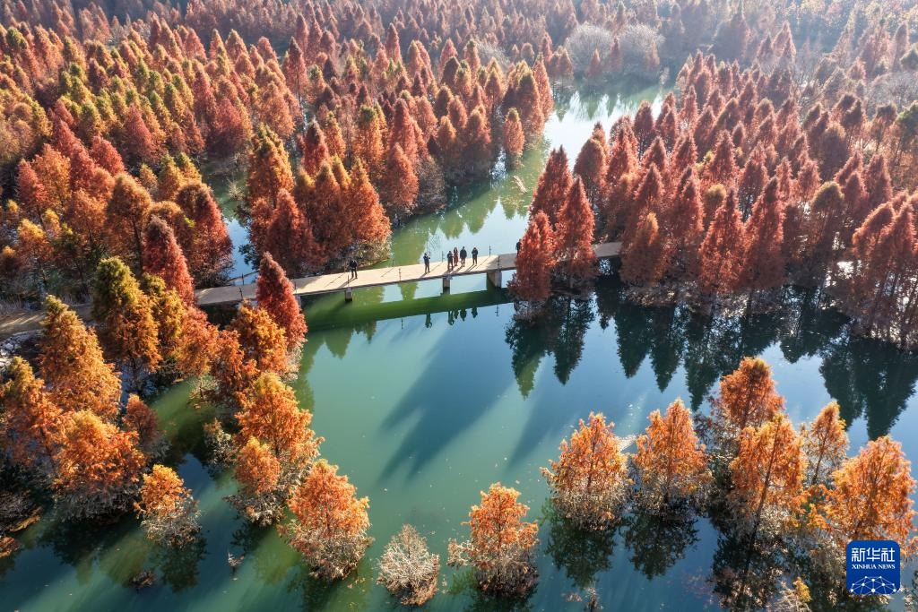 1月3日,游客在昆明市盘龙区滇源街道甸尾村水杉湿地赏景游玩(无人机照片)。