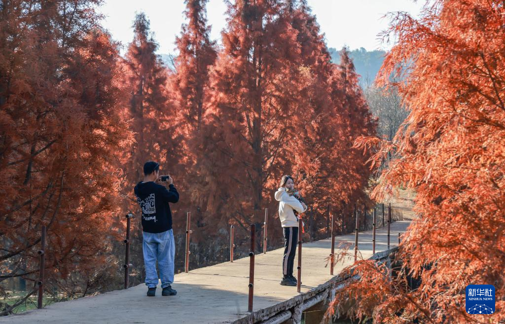 1月3日,游客在昆明市盘龙区滇源街道甸尾村水杉湿地赏景拍照。