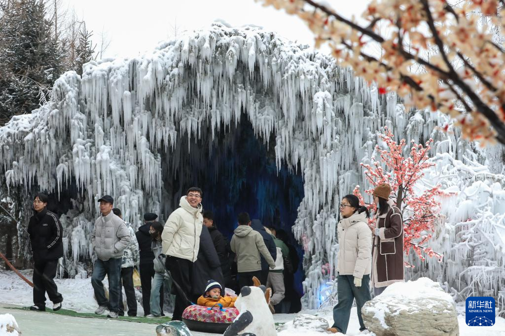 1月2日,游客在甘肃省临夏回族自治州和政县法台山景区的“爱心冰瀑”景观内游玩(手机照片)。