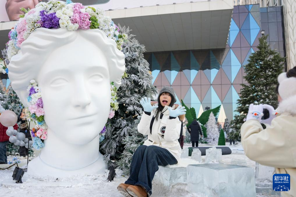 1月3日,游客在哈尔滨哈西万达广场前拍照。