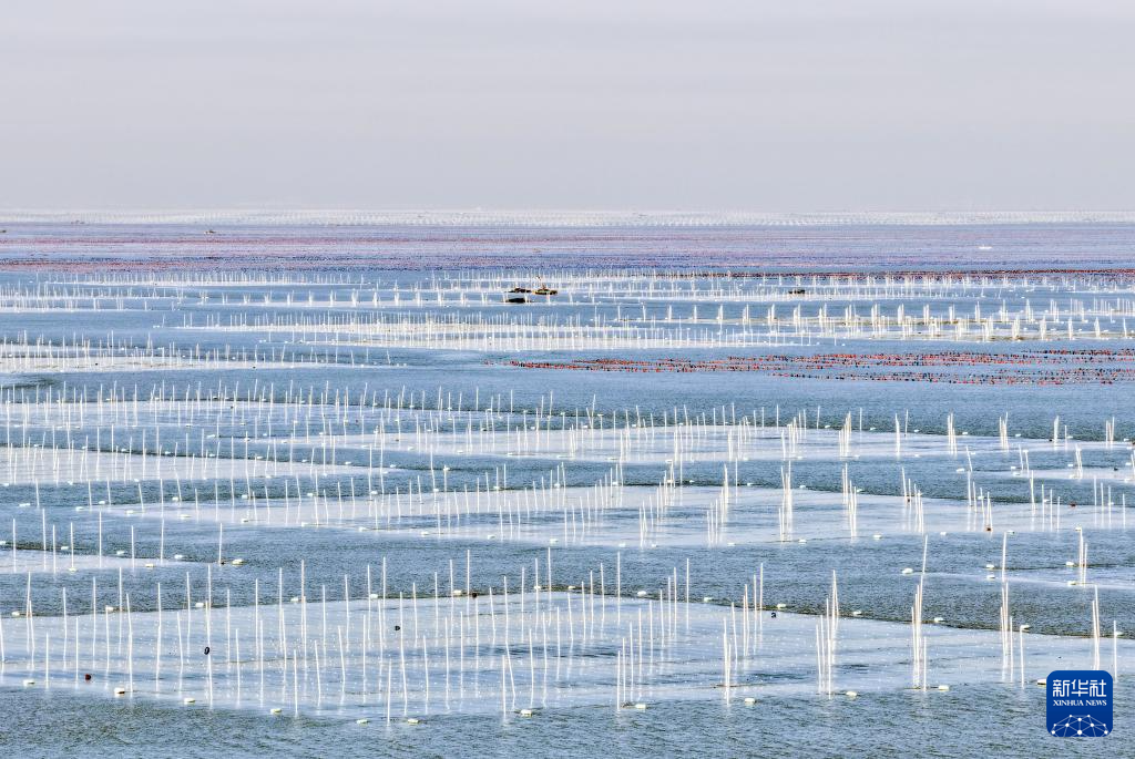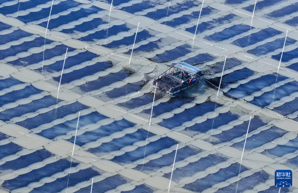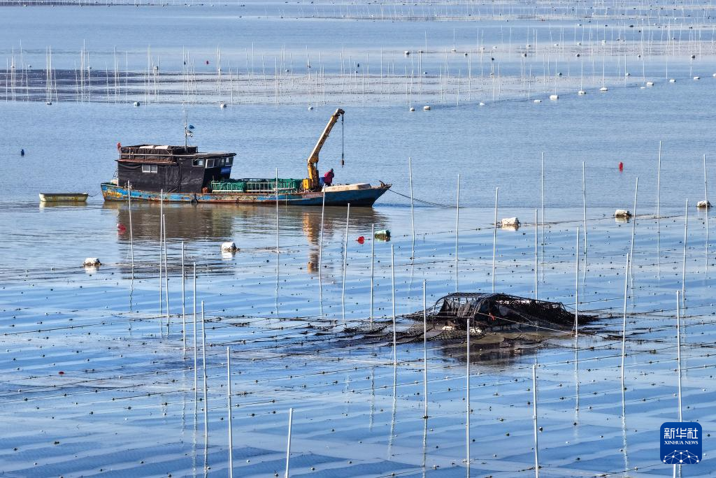 1月8日,渔民在江苏连云港市海州湾渔场养殖区收获条斑紫菜(无人机照片)。 眼下,江苏连云港市海州湾渔场养殖区的头茬条斑紫菜迎来收获时节,“海上菜园”到处都是抢收紫菜的繁忙景象。 新华社发(王健民 摄)