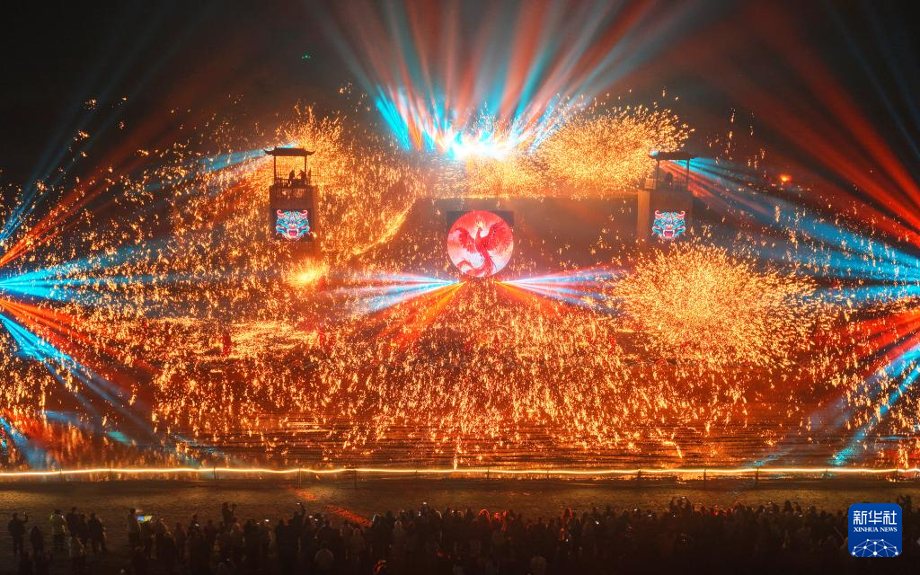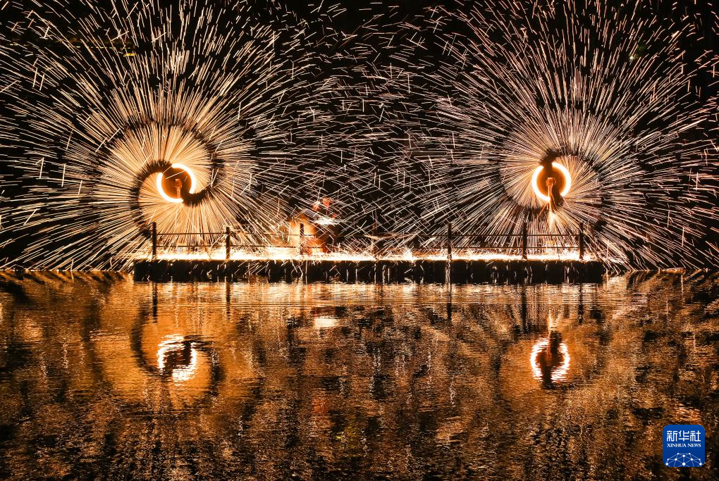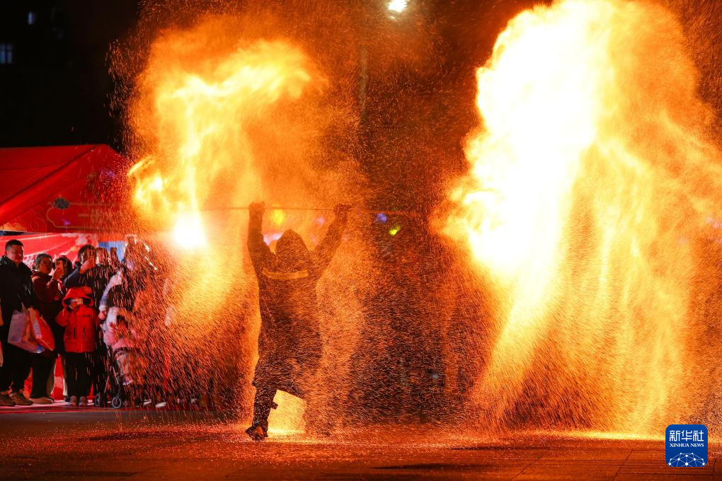 2月13日,在湖南省衡阳市南岳区1944景区,民间艺人表演打铁花。 新华社发(曹正平摄)