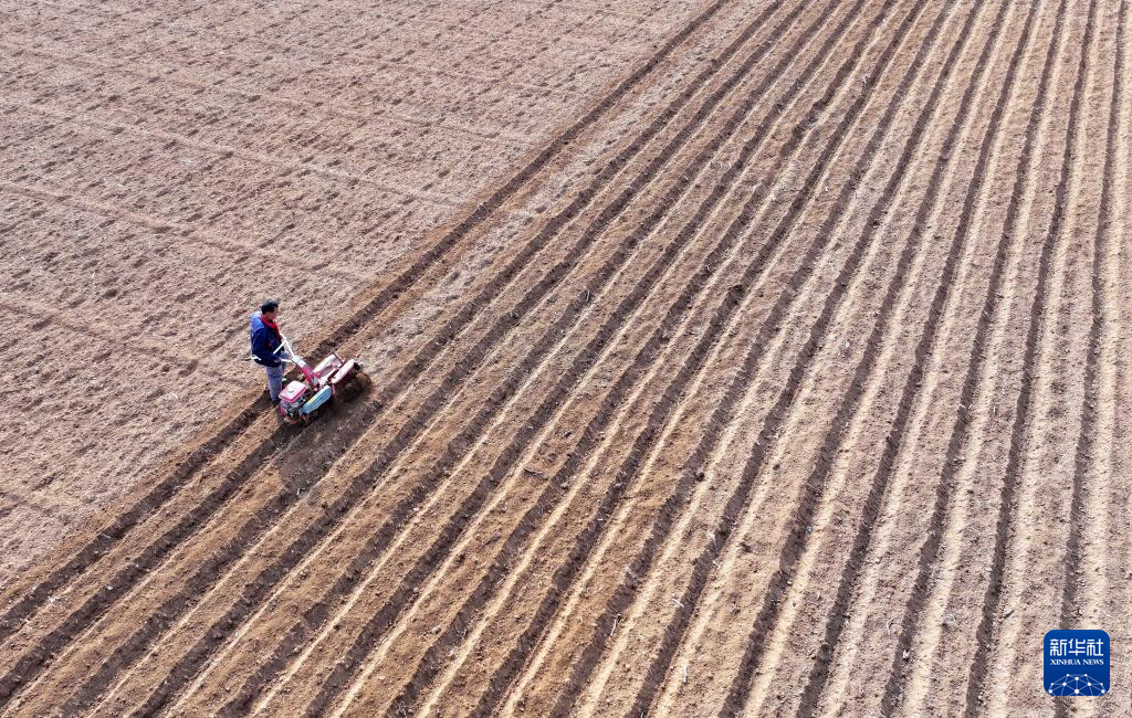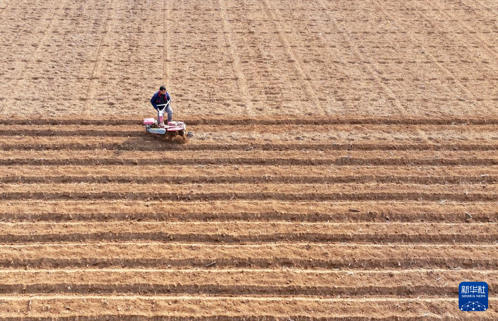 2月13日,在山东省枣庄市山亭区桑村镇,农民驾驶农机开沟准备播种马铃薯(无人机照片)。 近日,随着气温回升,山东省枣庄市山亭区农民积极开展春耕备耕,一派人勤春早的忙碌景象。 新华社发(李宗宪摄)
