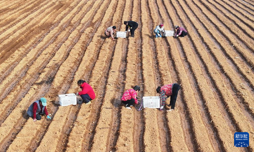2月13日,在山东省枣庄市山亭区桑村镇,农民在播种马铃薯(无人机照片)。 近日,随着气温回升,山东省枣庄市山亭区农民积极开展春耕备耕,一派人勤春早的忙碌景象。 新华社发(李宗宪摄)
