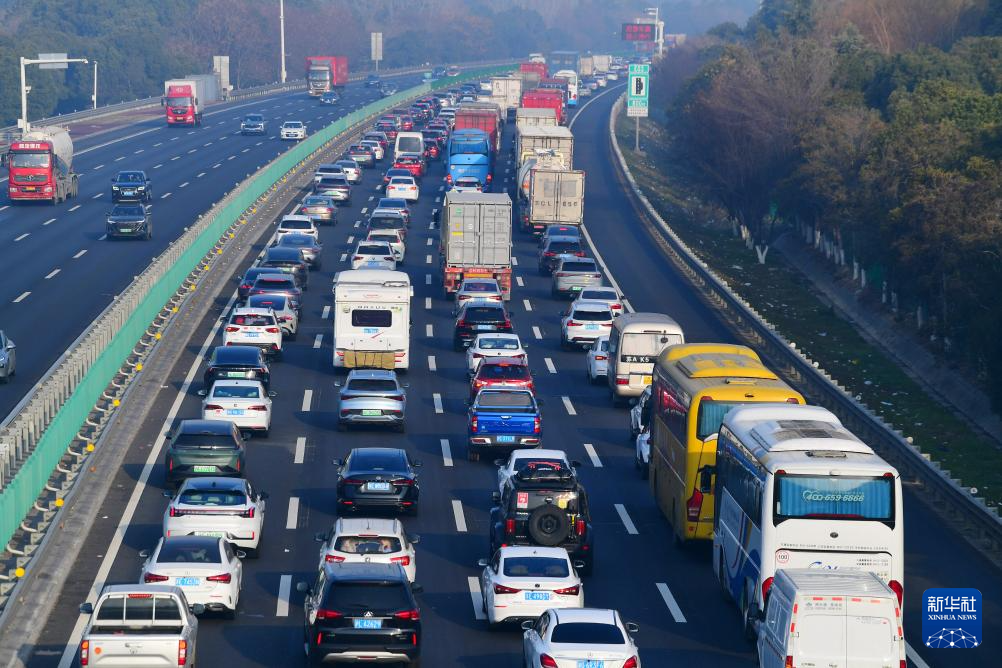 2月13日拍摄的京沪高速江苏无锡段的车流。 各地春运渐入高峰,人们准备回家过年。 新华社发(还月亮摄)