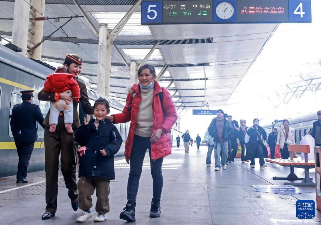 2月13日,在湖北省武昌站,武汉铁路志愿者协助旅客乘车出行。 各地春运渐入高峰,人们准备回家过年。 新华社发(赵军摄)