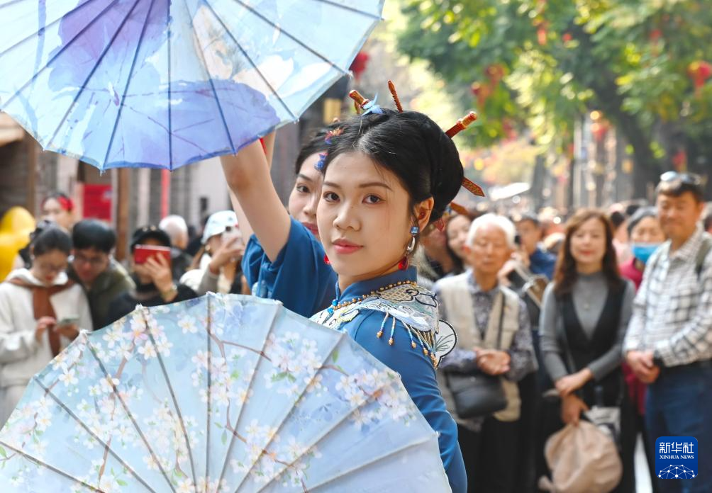 2月22日,演员在福州三坊七巷的南后街牌坊前表演国风舞蹈。 春节假期,福州的历史文化街区、公园内,处处洋溢着新春的喜庆气氛。戏剧展演、闽味市集、国潮打卡等活动,不仅让福州市民重温记忆中的年味,更让外地游客沉浸式感受闽都文化的独特魅力,享受一场闽式文旅大餐。 新华社记者 林善传 摄