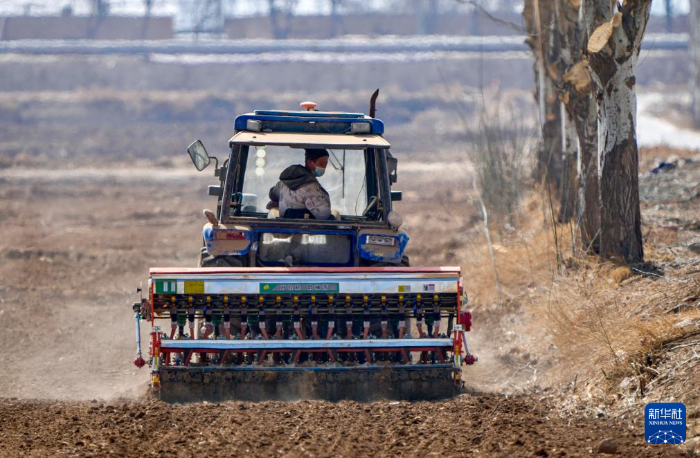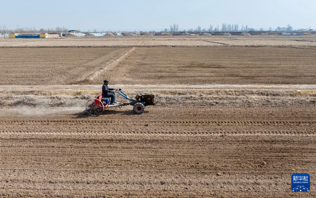2月24日,在宁夏银川市贺兰县金贵镇银河村,农民驾驶自动播种机播种小麦。 近日,宁夏银川市贺兰县的农民积极开展小麦春耕备耕,田间地头一片繁忙的景象。 新华社记者 杨植森 摄