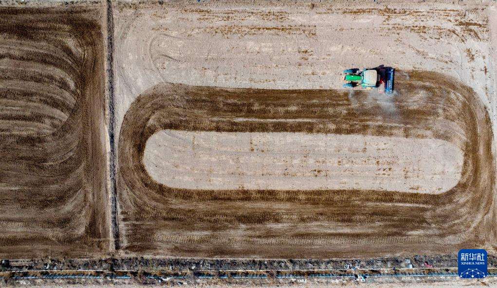 2月24日,在宁夏银川市贺兰县金贵镇银河村,农民驾驶旋耕机平整土地(无人机照片)。 近日,宁夏银川市贺兰县的农民积极开展小麦春耕备耕,田间地头一片繁忙的景象。 新华社记者 杨植森 摄