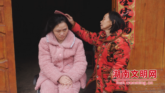 陈米秀是邵阳市洞口县长塘瑶族乡老艾坪村村民。陈米秀家里共有6口人,其丈夫眼睛患白内障无法务工,儿子常年在县城打零工,承担养家糊口的重任。2010年,一场突如其来的不幸降临在了这个原本就不殷实的家庭,儿媳沈美玲骑车不慎摔下堡坎,导致半身瘫痪,失去言语能力。自此不论是家务还是照顾儿媳、教育两个孙子都由陈米秀操持着。