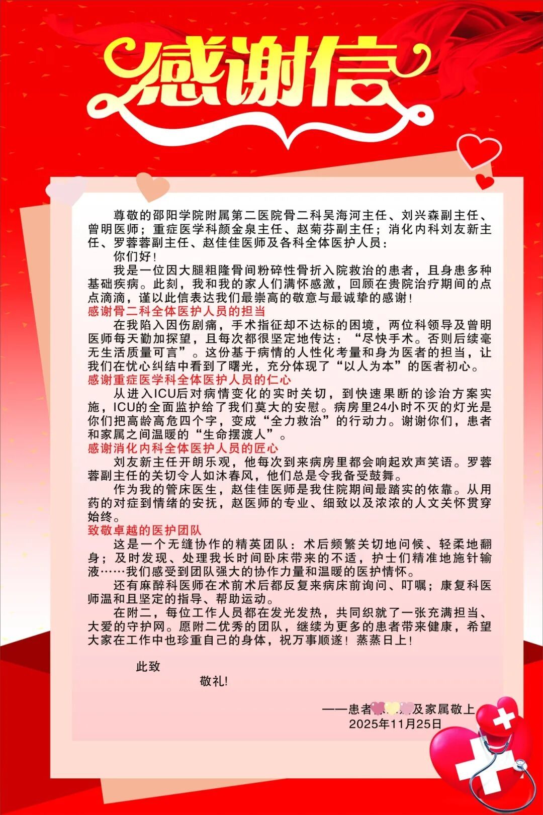 邵阳新闻网12月6日讯(通讯员 赵佳佳)“是你们给了我们全家温暖的依靠,太感谢你们了……”近日,邵阳学院附属第二医院消化内科收到一封情真意切的感谢信,随同而来的还有一面承载着患者及家属满满敬意的锦旗。这两份特殊的“礼物”,既是对消化内科、骨二科、重症医学科、麻醉科、康复科全体医护人员的由衷致谢,更是对医院“以患者为中心”多学科协作(MDT)诊疗模式的生动诠释与高度认可。
