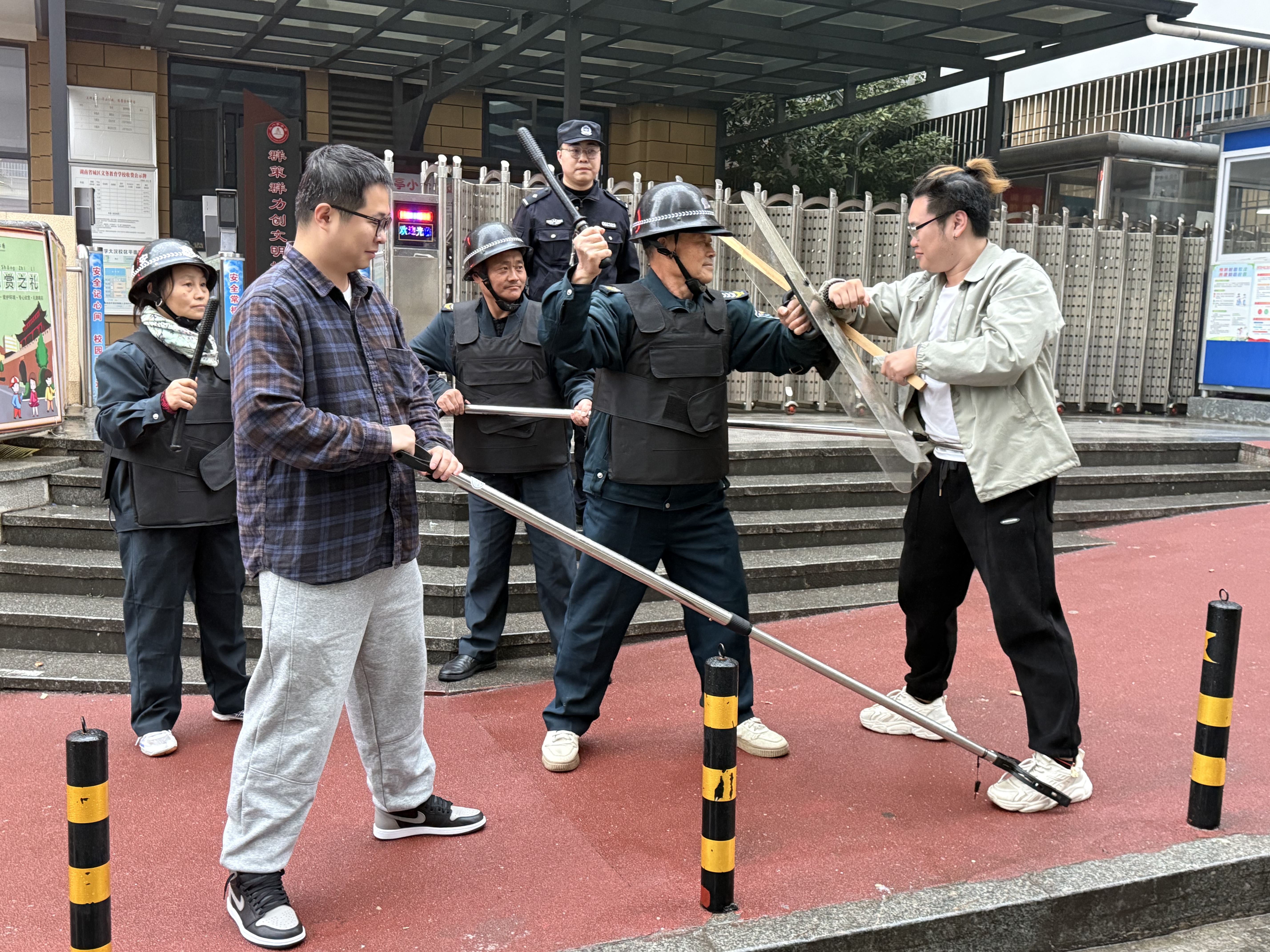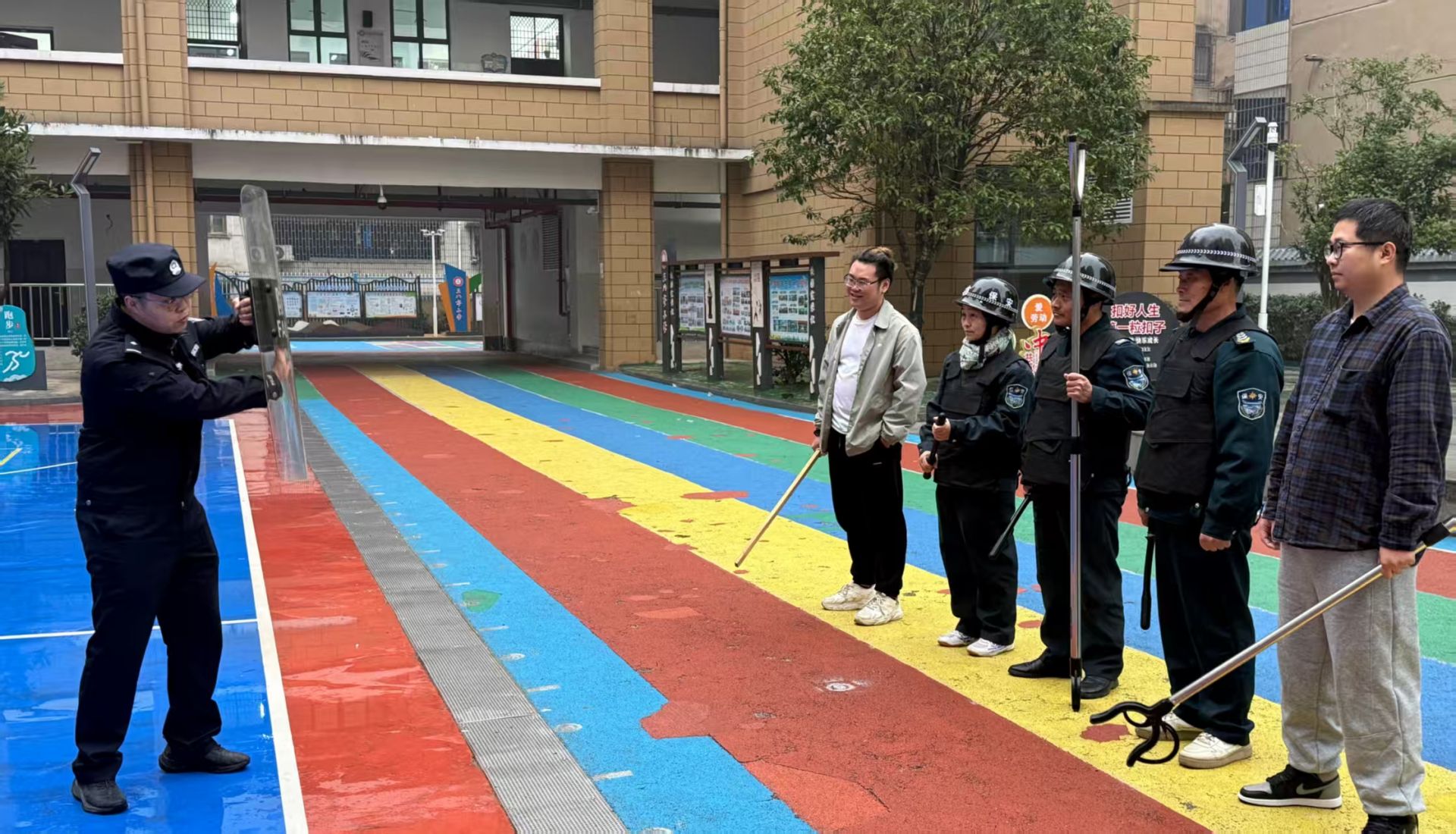 此次演练模拟了校园门口可能发生的突发安全事件。随着演练指令下达,在学校安保人员和护校教师迅速反应的同时,现场指导的谭警官也密切关注处置流程。参演人员紧密配合,在专业指导下,熟练运用防暴盾牌、钢叉等器械,对模拟险情进行了快速、有效的先期控制,整个流程紧张有序,环节衔接流畅。