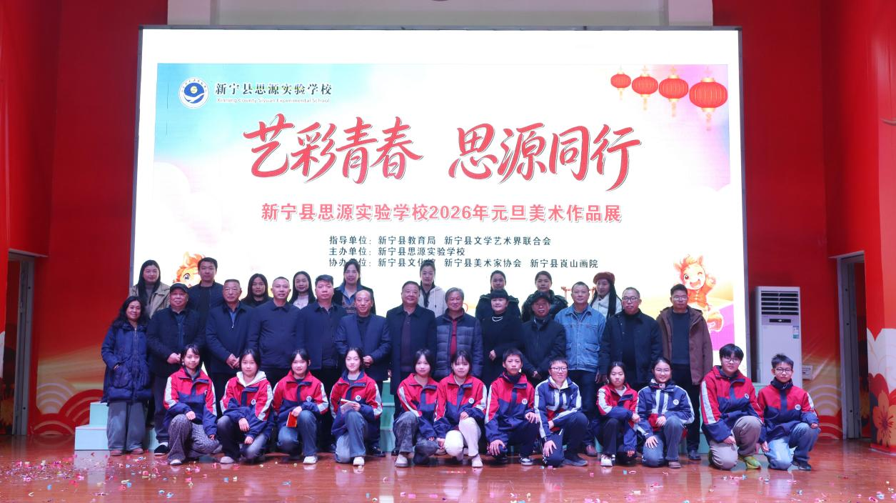 邵阳新闻网12月30日讯(通讯员 鄢跃斌 刘海)12月30日,新宁县思源实验学校内翰墨飘香、佳作纷呈,以“艺彩青春,思源同行”为主题的2026年元旦师生美术作品展正式拉开帷幕。全校师生与受邀嘉宾齐聚一堂,共赏笔墨丹青里的校园风貌、崀山神韵,在艺术熏陶中喜迎新年。