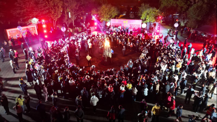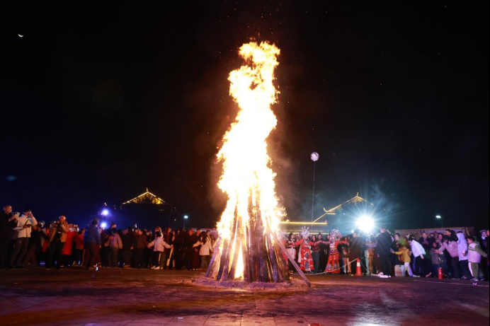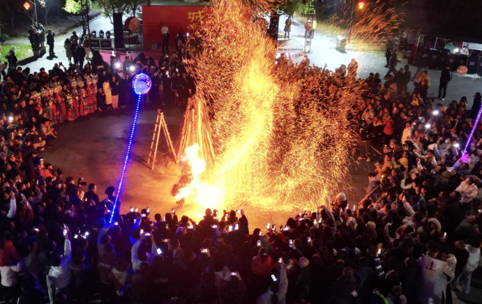 夜幕降临,南湖公园内篝火燃起,火光映照着人们的笑脸,也点燃了现场的欢乐气氛。当地苗族同胞身着绚丽多彩的民族服饰,为游客们带来了精彩纷呈的非遗文化展示。竹竿舞现场,苗族阿哥阿妹们在竹竿分合的间隙中灵活跳跃,动作矫健而富有节奏感,游客们跃跃欲试,纷纷加入竹竿舞的行列,体验这项古老而独特的舞蹈艺术;木叶吹歌环节,苗族艺人用木叶吹奏出悠扬动听的旋律,声音仿佛来自大自然的馈赠,让人心旷神怡,游客们听得如痴如醉,纷纷报以热烈的掌声;苗歌秀更是将现场氛围推向高潮,苗族歌手们用高亢嘹亮、宛转悠扬的歌声,唱出了苗乡人民对生活的热爱、对新年的祝福,现场一片欢歌笑语。