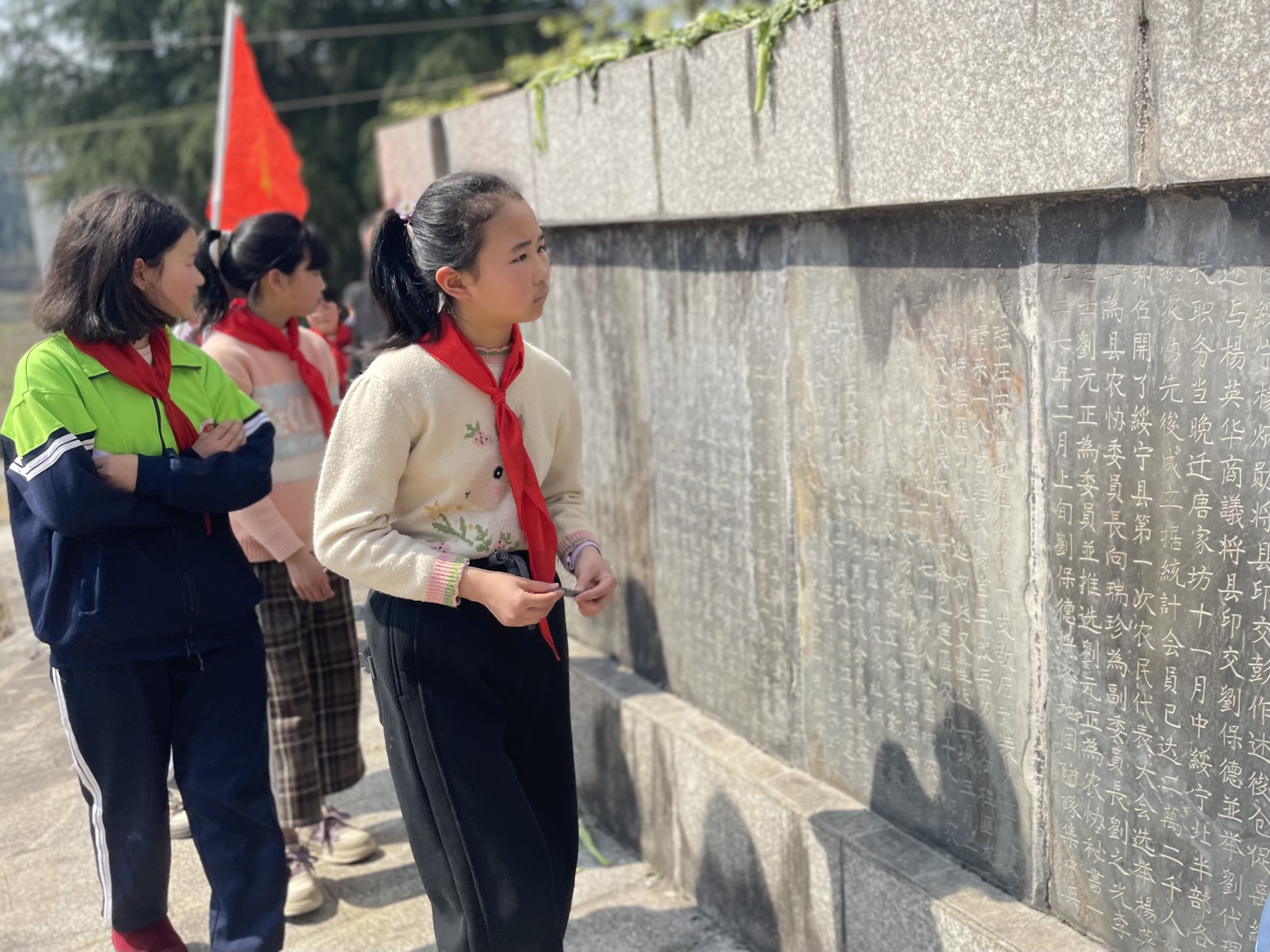 在巍峨的纪念碑前,少先队员们行队礼并献上花圈,肃立默哀三分钟。校长刘思华以贺炳炎将军的事迹为引,动情讲述其1935年在无麻药情况下截肢的壮举:“手术持续2小时17分钟,他咬碎20多条毛巾,醒来第一句话是‘敌人消灭了吗?’这就是中国人的硬骨头精神!”在场学生无不动容。随后,师生绕行瞻仰纪念碑,研读碑文记载的烈士生平。最后全体学生面向纪念碑呼号——“时刻准备着,为共产主义事业而奋斗!”铿锵誓言回荡陵园,展现出新时代少年的担当。
