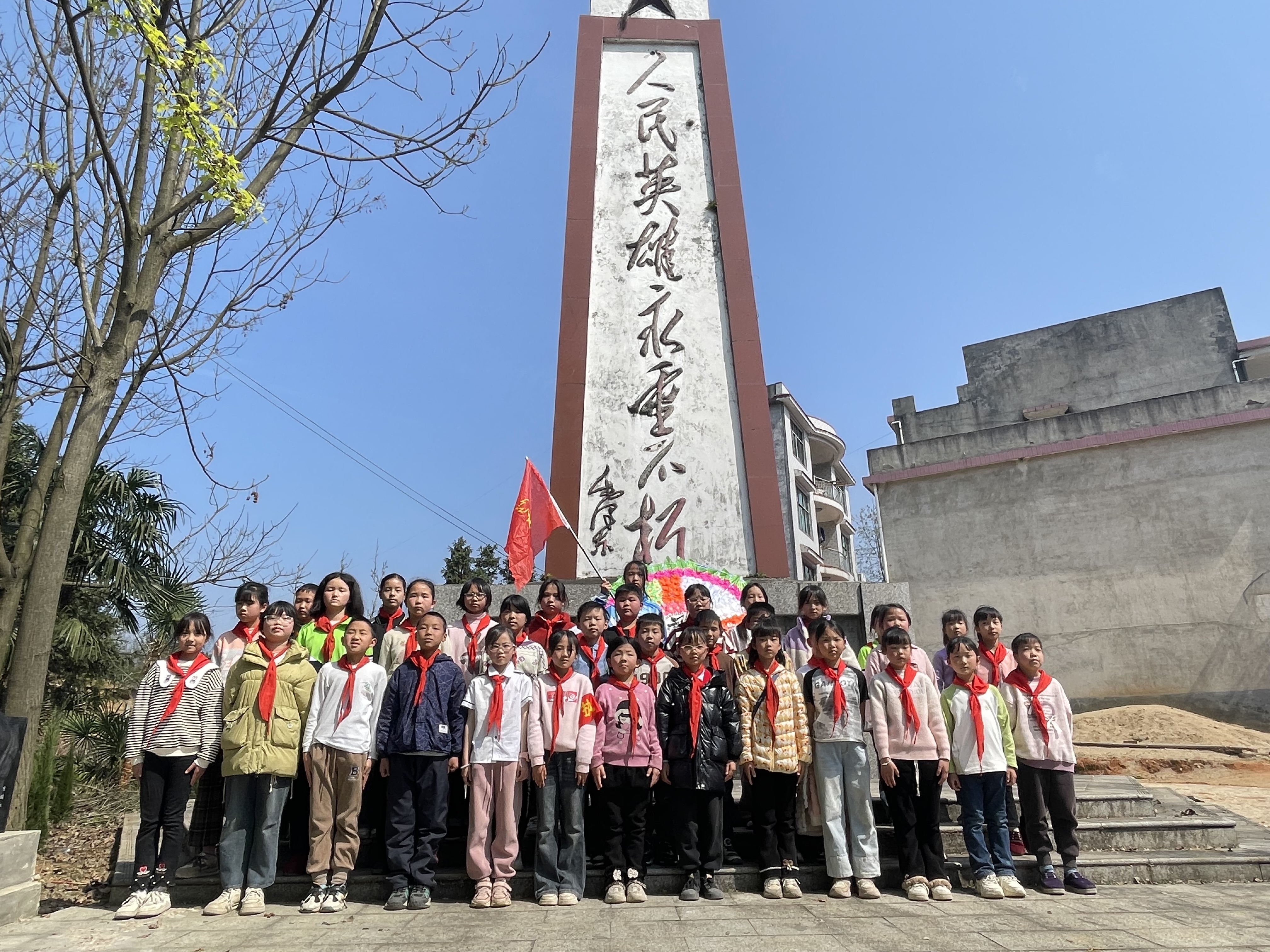 上午10时,少先队员们统一佩戴红领巾,在少先队旗引领下,队伍徒步1.5公里前往陵园,行进途中,学校政教主任彭玉香向学生讲述黄土矿镇人民英雄纪念碑的历史,深化学生对家乡红色文化的认知。
