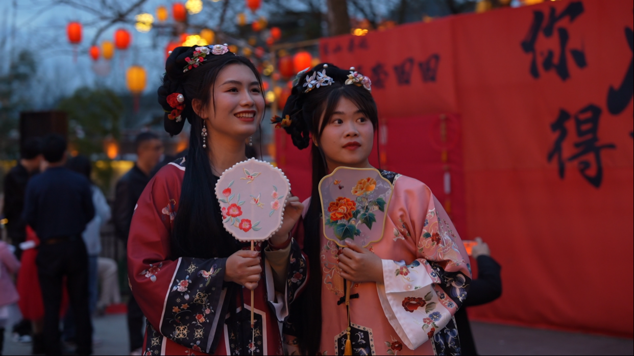 游客 曾若云:今天特意约了闺蜜穿了古装来崀山玩,感觉今年崀山在花灯节上花费了很多的心思和工夫,文艺表演、山野集市、各类年俗活动都很有特色,既热闹又有趣还很温馨浪漫。