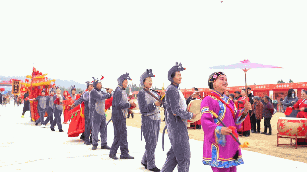 木槌叩击、翻飞跳跃.....上午10时许,30余人的潮汕英歌舞巡游点燃现场氛围。舞者身着色彩鲜艳的传统服饰,脸画各色脸谱,手持短棍,个个精神抖擞,在节奏分明的鼓点声中,精彩的表演让观众赞叹不已。紧接着,舞龙、舞狮、滩头年画作品《老鼠娶亲》情景表演、福禄寿喜财人偶巡游等民俗表演为当地带来浓郁年味和文化盛宴。