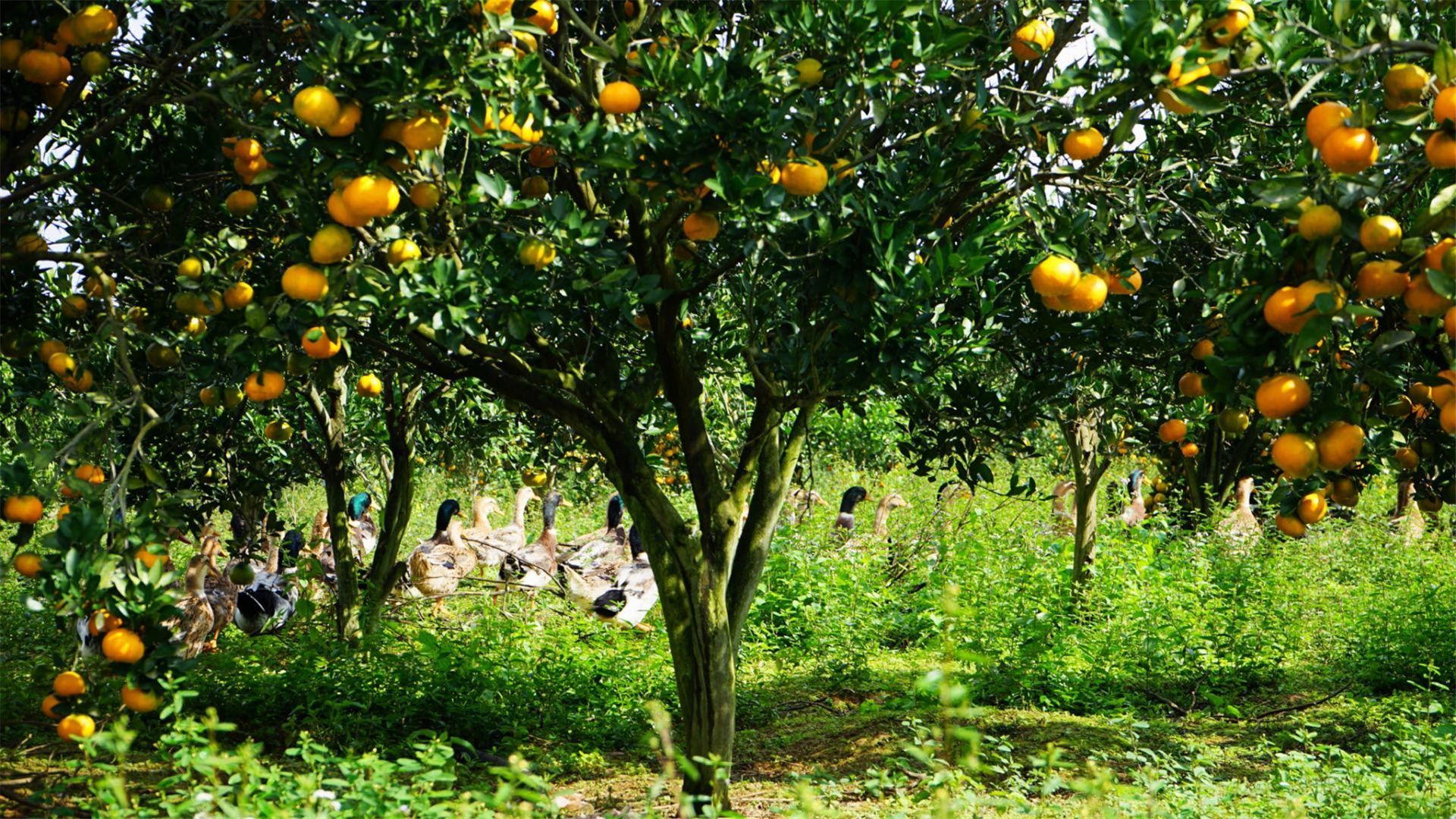 桔树下欢跑的鸭群